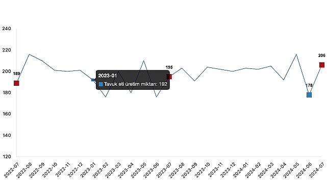 Bir evvelki ay 177 bin 740 ton olan tavuk eti üretimi Temmuz ayında %15,7 oranında artarak 205 bin 656 ton oldu.